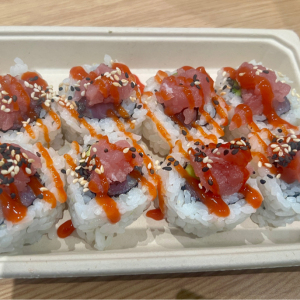gambero fritto, insalata, mandorle, cipolle crispy, mandorle, maio, teriyaki, piccante